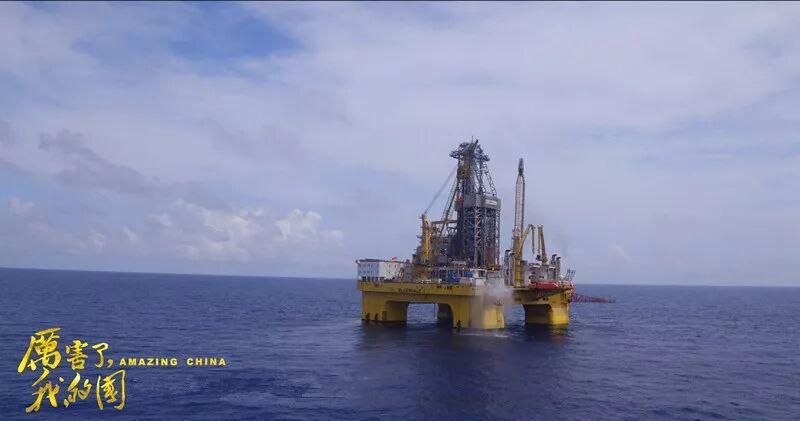 镜头描述:“蓝鲸一号”,是承担我国首次海域天然气水合物(可燃冰)开采任务的钻井平台。世界最大、钻井深度最深的双井架半潜式钻井平台,净重超过43000吨,面积是一个标准足球场的1.5倍,从船体到钻井架顶端相当于37层楼高,是我国自主制造的“大国重器”,堪称海工装备的“航空母舰”。