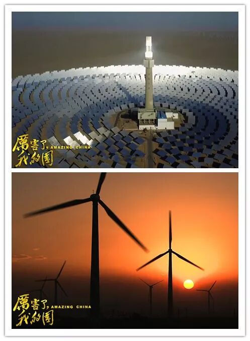 镜头描述:敦煌熔岩塔斯光热发电、太阳能光伏发电、风力发电,安全可靠,无污染,是可持续能源。